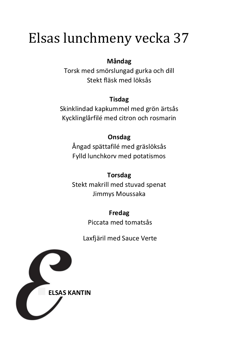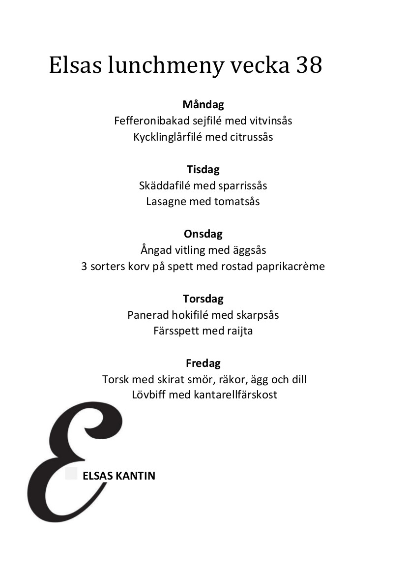 Elsas Kantin är vår fräscha lunchrestaurang där fokus ligger på vällagad mat som serveras snabbt med ett rikligt utbud av tillbehör. Kvällstid fungerar restaurangen som festvåning och från första advent serverar vi vårt traditionella julbord. Välkommen till Elsas - du hittar oss på Eskilstunavägen 34 i Gula Rosornas Företagsby!