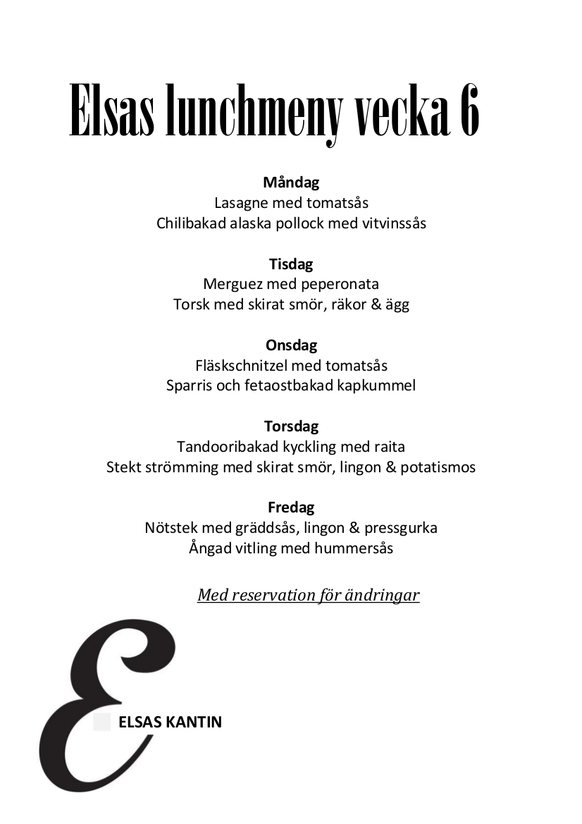 Elsas Kantin är vår fräscha lunchrestaurang där fokus ligger på vällagad mat som serveras snabbt med ett rikligt utbud av tillbehör. Kvällstid fungerar restaurangen som festvåning och från första advent serverar vi vårt traditionella julbord. Välkommen till Elsas - du hittar oss på Eskilstunavägen 34 i Gula Rosornas Företagsby!