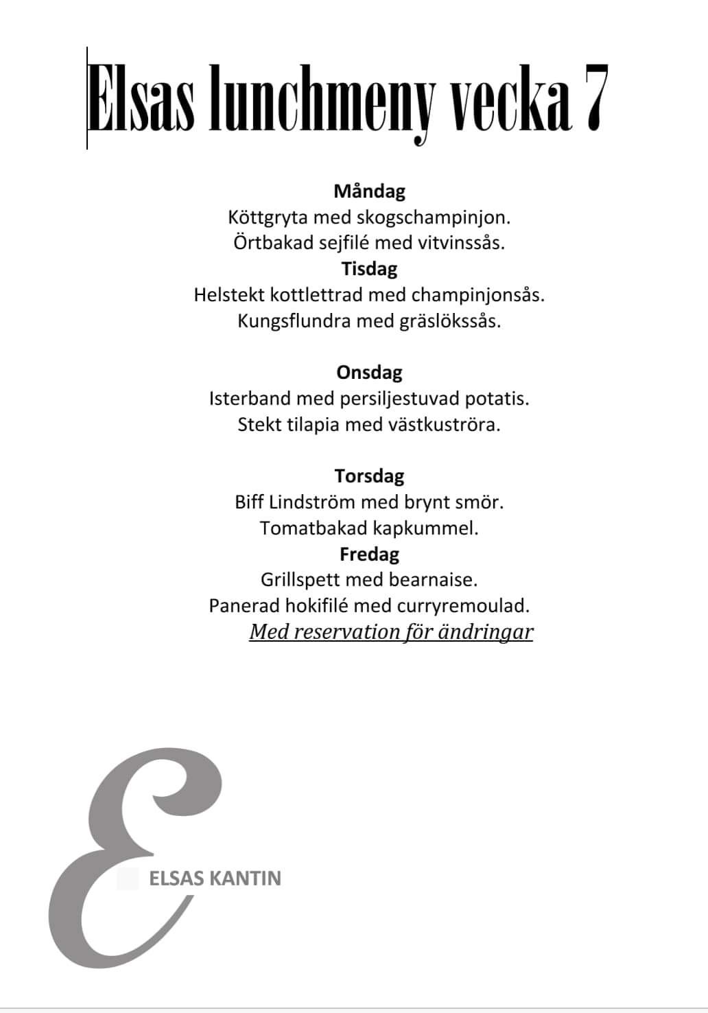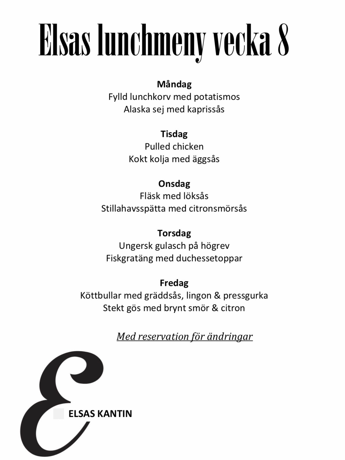 Elsas Kantin är vår fräscha lunchrestaurang där fokus ligger på vällagad mat som serveras snabbt med ett rikligt utbud av tillbehör. Kvällstid fungerar restaurangen som festvåning och från första advent serverar vi vårt traditionella julbord. Välkommen till Elsas - du hittar oss på Eskilstunavägen 34 i Gula Rosornas Företagsby!