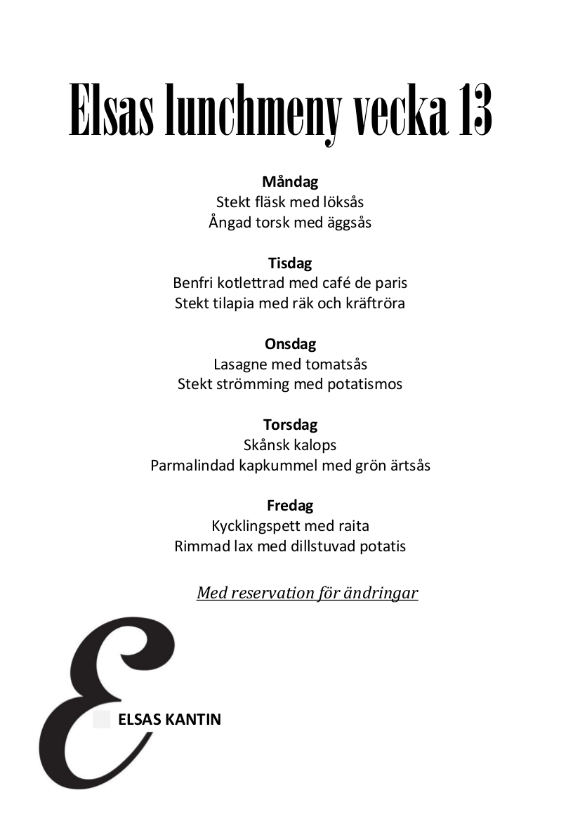 Elsas Kantin är vår fräscha lunchrestaurang där fokus ligger på vällagad mat som serveras snabbt med ett rikligt utbud av tillbehör. Kvällstid fungerar restaurangen som festvåning och från första advent serverar vi vårt traditionella julbord. Välkommen till Elsas - du hittar oss på Eskilstunavägen 34 i Gula Rosornas Företagsby!